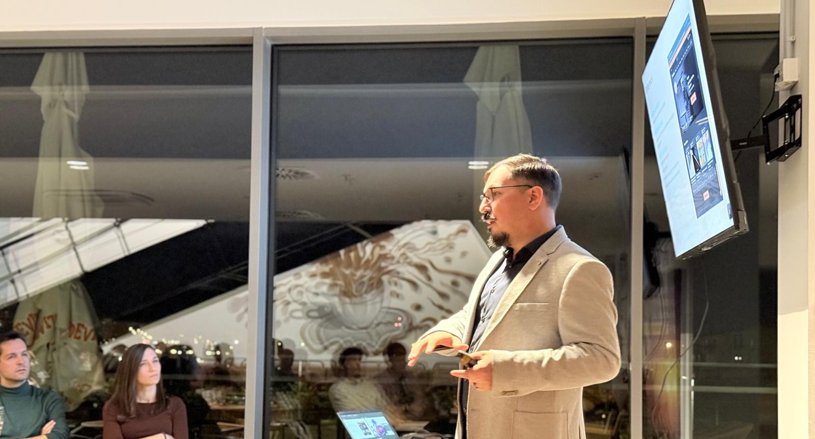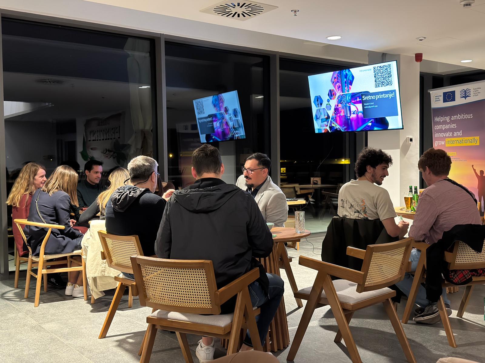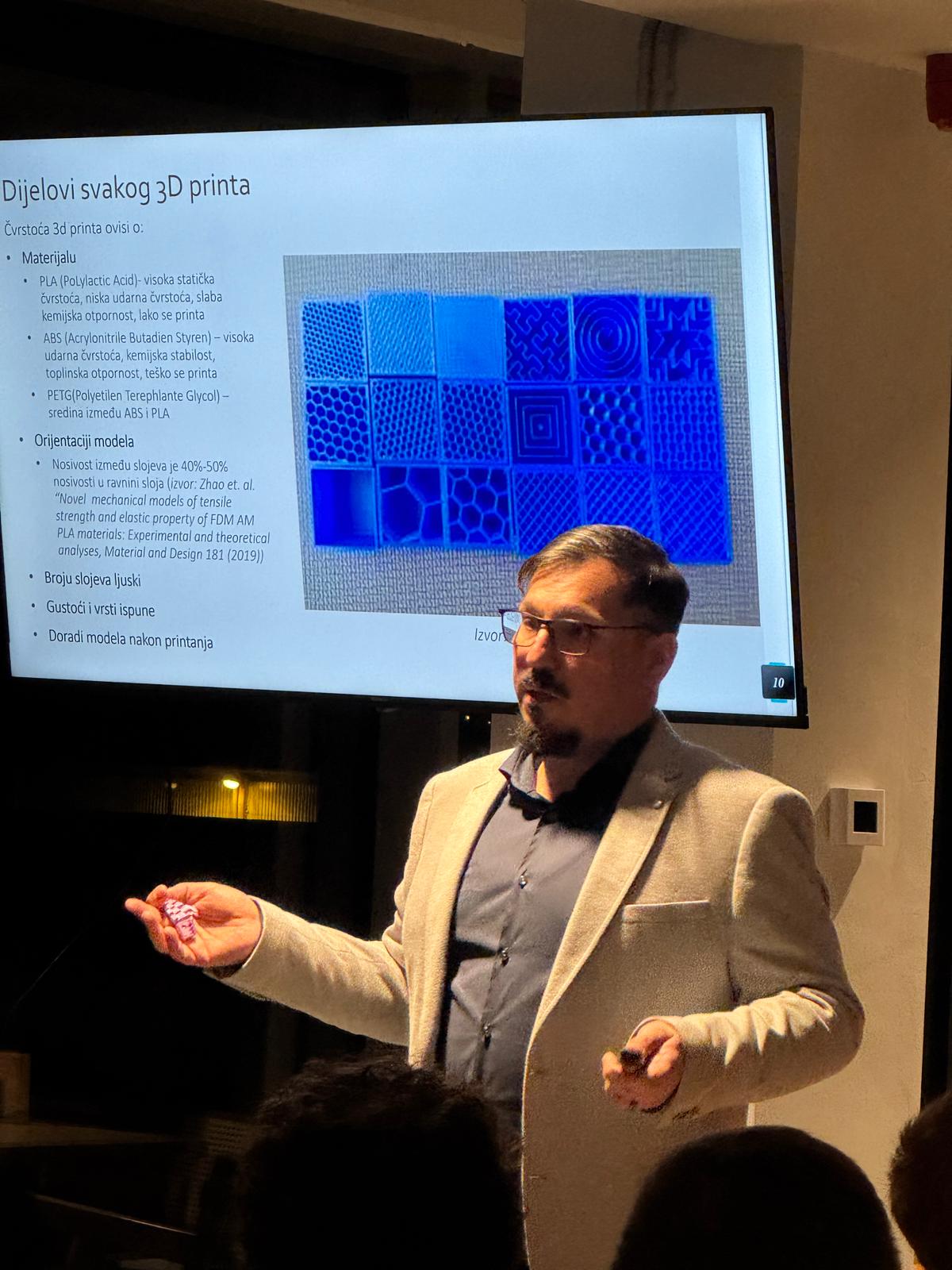 Okupljanje je započelo druženjem i upoznavanjem sudionika, nakon čega je uslijedila prezentacija izv. prof. Vladimira Divića s Fakulteta građevinarstva, arhitekture i geodezije Sveučilišta u Splitu. U svom izlaganju pod nazivom „Od funkcionalnih 3D printova do prototipa“, profesor Divić predstavio je proces transformacije ideje u fizički model, tako što je naglasio važnost 3D printanja kao alata za brzu izradu i testiranje prototipova. Po završetku prezentacije sudionici su nastavili druženje u opuštenoj atmosferi, uz neformalne razgovore i razmjenu iskustava iz područja 3D tehnologija.